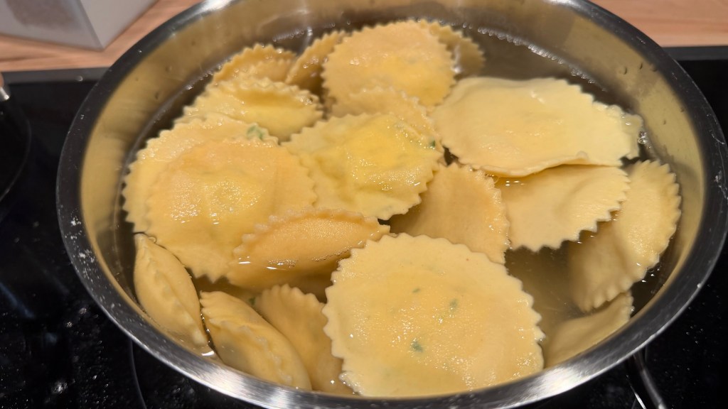 Die Ravioli in siedendem (nicht sprudelndem!) Salzwasser für ca. 3–4 Minuten gar ziehen lassen, bis sie an der Oberfläche schwimmen.